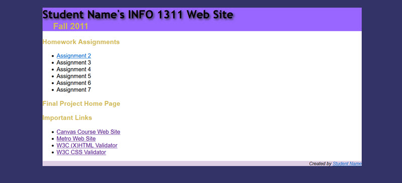 - Open your default.htm file created in Assignment 1. Link the external CSS file named assignment2.css to your course home page (default.htm) created in Assignment 1 using the <link> tag.